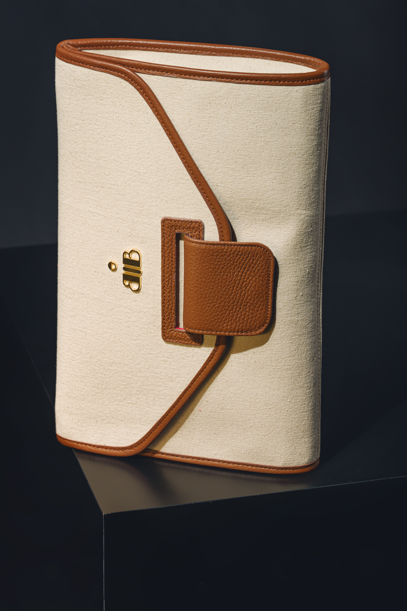 - Canvas and brown leather, with a red fabric interior and an internal pocket and leather details