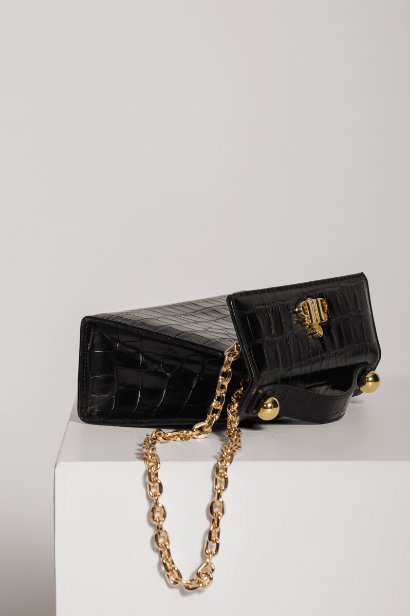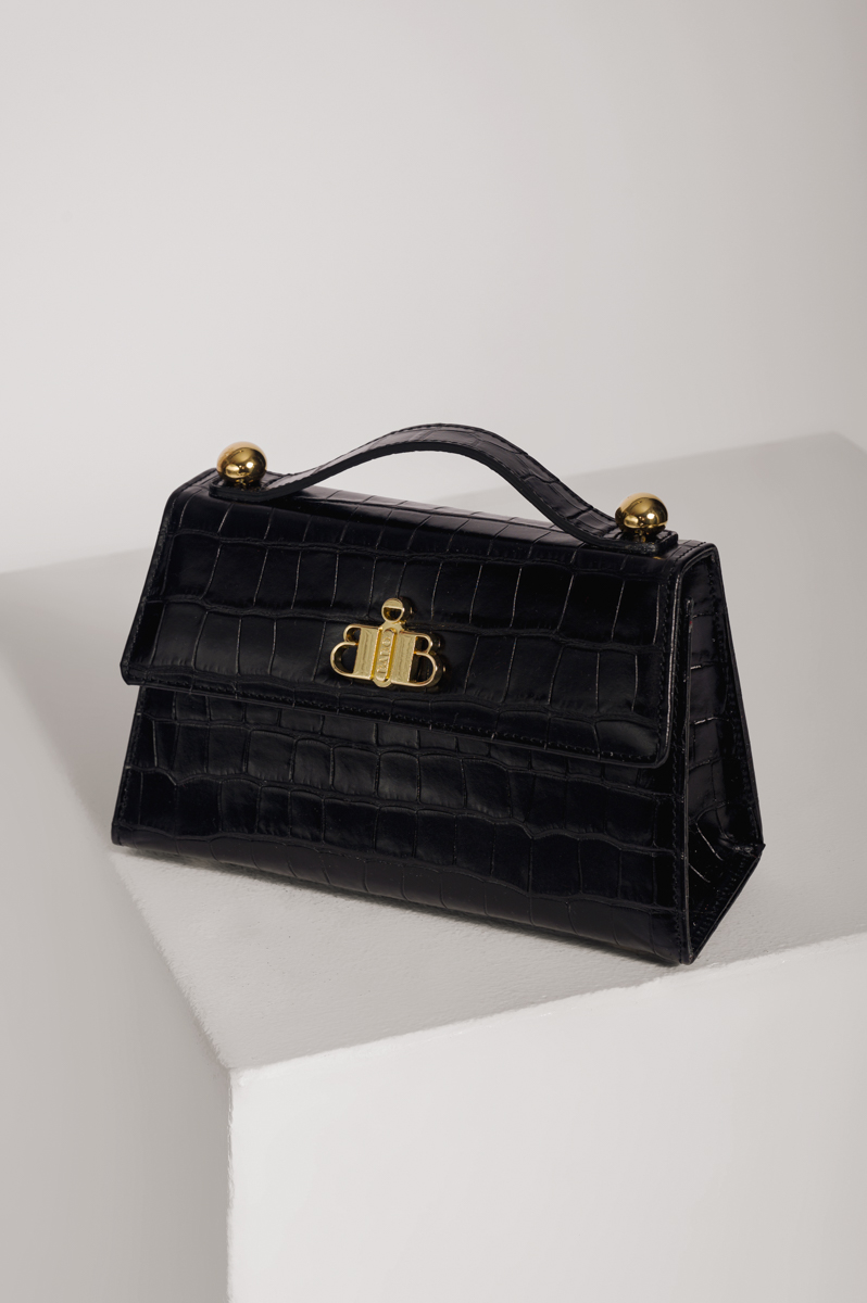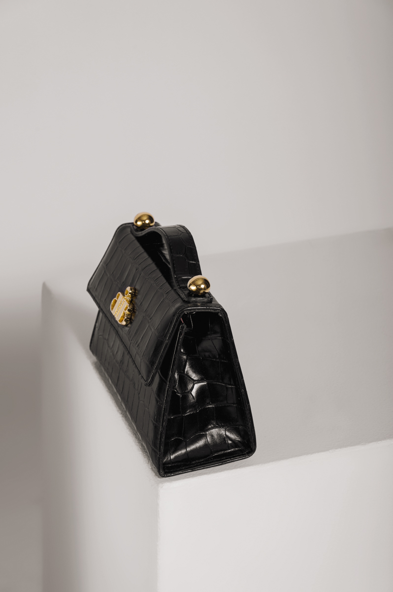“EMILY B” is a luxurious black A-line structured purse with a crocodile embossed leather. It features a top handle and a fold-over flap secured with an elegant gold tone clasp that has a decorative logo. The bag also includes a gold chain strap, allowing for shoulder or crossbody wear. The design is enhanced by two spherical gold accents on either side of the handle, adding a touch of sophistication. The overall aesthetic is chic, polished, and versatile, making it suitable for both formal and casual occasions.